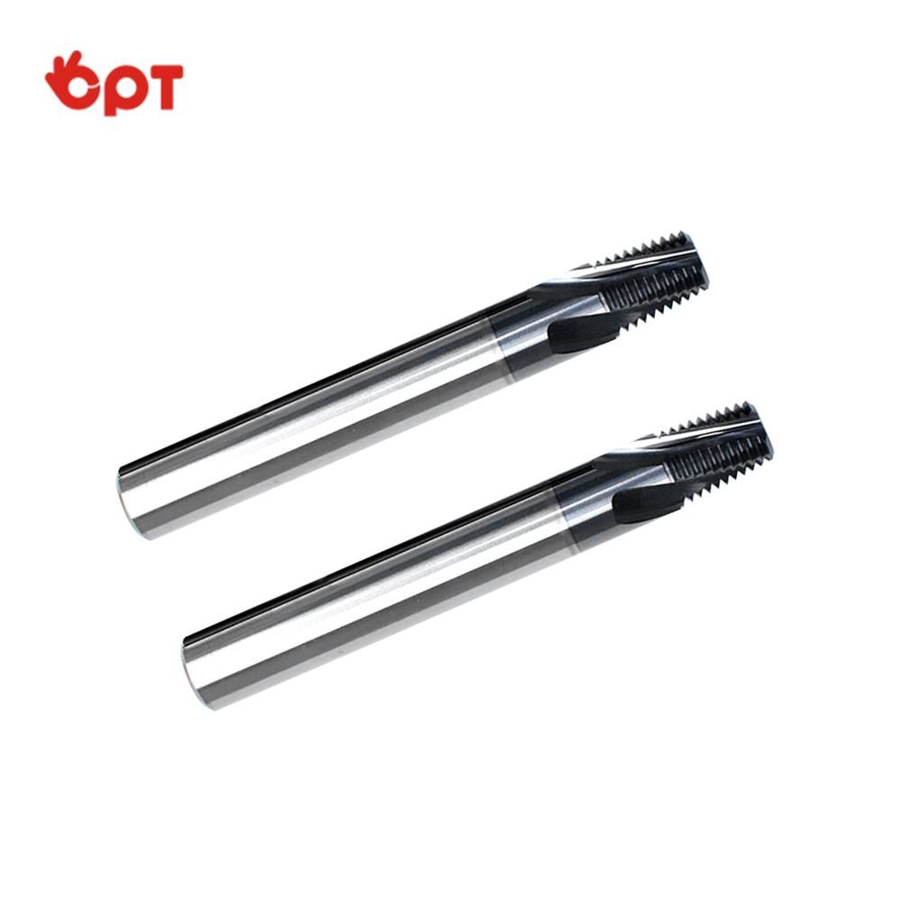 The thread machining of high hardness materials and high-temperature alloy materials, such as titanium alloy and nickel based alloy, has always been a relatively difficult problem, mainly because high-speed steel cones have a shorter tool life when machining the threads of these materials. However, using a hard alloy thread milling cutter for machining hard material threads is an ideal solution. The machinability hardness is HRC58-62. For thread processing of high-temperature alloy materials, thread milling cutters also show excellent machining performance and unexpected long lifespan. For threaded holes with the same pitch and different diameters, using a tap for machining requires multiple cutting tools to complete. However, if using a thread milling cutter for machining, only one cutting tool can be used. After the tap is ground and the processed thread size is less than the tolerance, it cannot be used anymore and can only be scrapped; When the thread milling cutter is worn and the size of the processed thread hole is less than the tolerance, necessary tool radius compensation adjustments can be made through the CNC system to continue processing qualified threads. Similarly, in order to obtain high-precision threaded holes, using a thread milling cutter to adjust the tool radius is much easier than producing high-precision taps. For small diameter thread processing, especially for high hardness and high-temperature materials, the tap may sometimes break, block the threaded hole, and even cause parts to be scrapped; Using a thread milling cutter, due to the smaller diameter of the tool compared to the processed hole, even if it is broken, it will not block the base thread hole, making it very easy to remove and will not cause parts to be scrapped; By using thread milling, the cutting force of the cutting tool is significantly reduced compared to the tap, which is particularly important for machining large diameter threads. This solves the problem of the machine tool being overloaded and unable to drive the tap for normal machining.The machine clamp blade type thread milling cutter was introduced a year ago, and people have also realized that when machining threaded holes above M20 on a machining center, using a thread milling cutter can significantly reduce processing costs compared to using a tap. However, in recent years, the design and production technology of overall hard alloy thread milling cutters have gradually matured, and a series of products with a complete range of sizes have been developed. For the application of small diameter thread machining, an aviation enterprise needs to process 50 M1.6×0.35 thread drilling holes on an aluminum component. The customer encountered a problem: due to the blind hole, chip removal is difficult, and it is easy to break when using a tap for machining; As tapping is the final process, if the part is scrapped, the significant processing time spent on the part will be completely lost. Finally, the customer selected a thread milling cutter for processing M1.6×0.35 threads, with a linear speed of Vc=25m/min and a speed of S=4900r/min (machine limit), and a feed rate of fz=0.05mm/r per revolution. The actual processing time was 4 seconds per thread, and all 50 workpieces were completed with one tool.